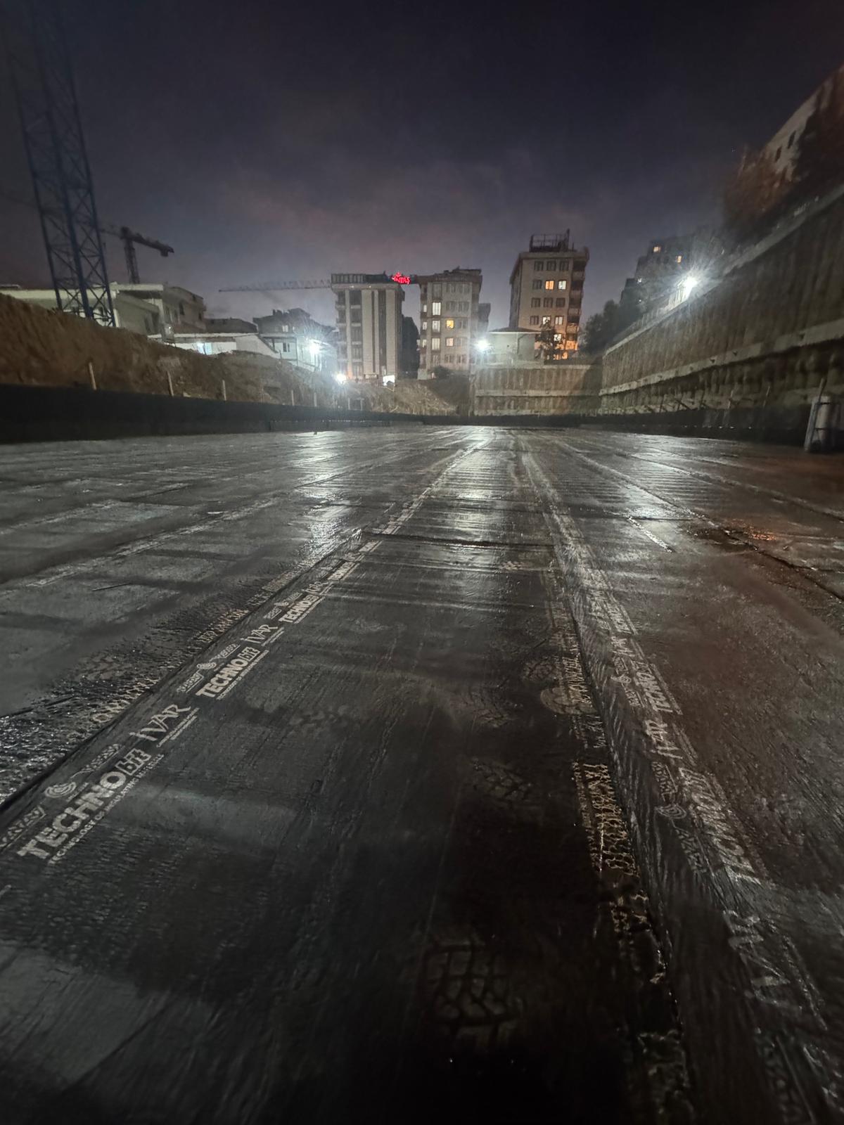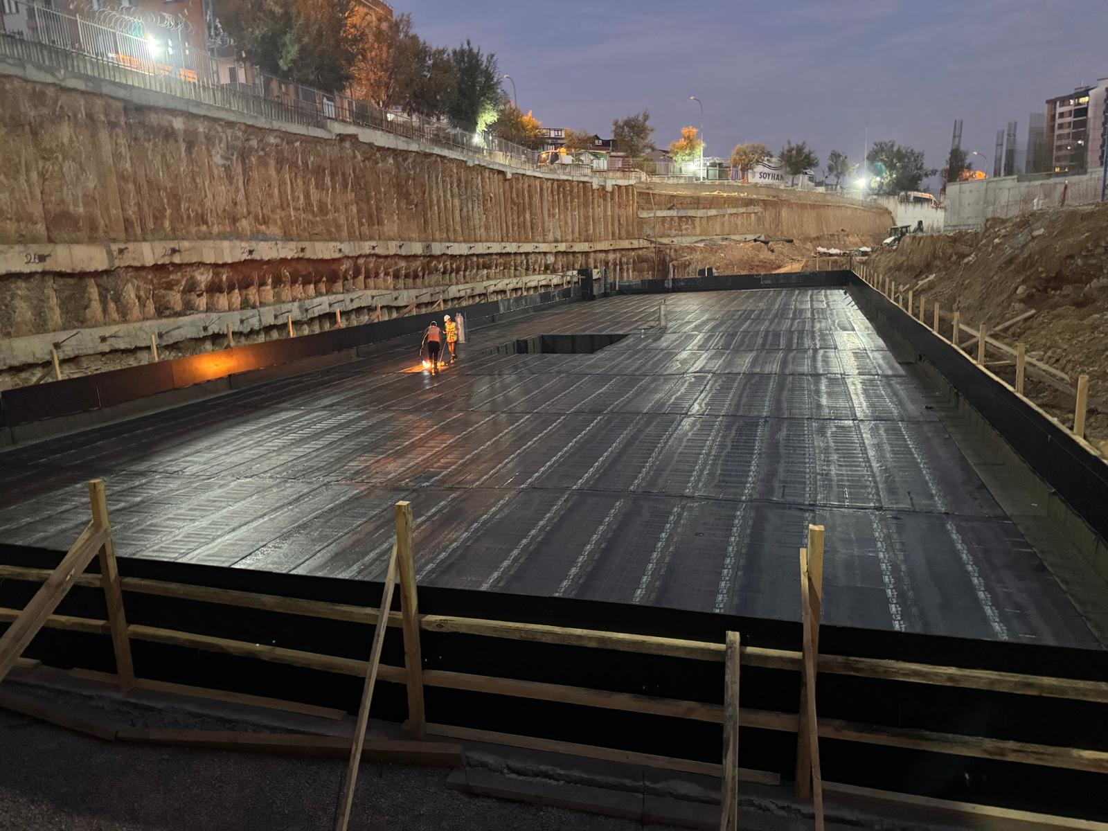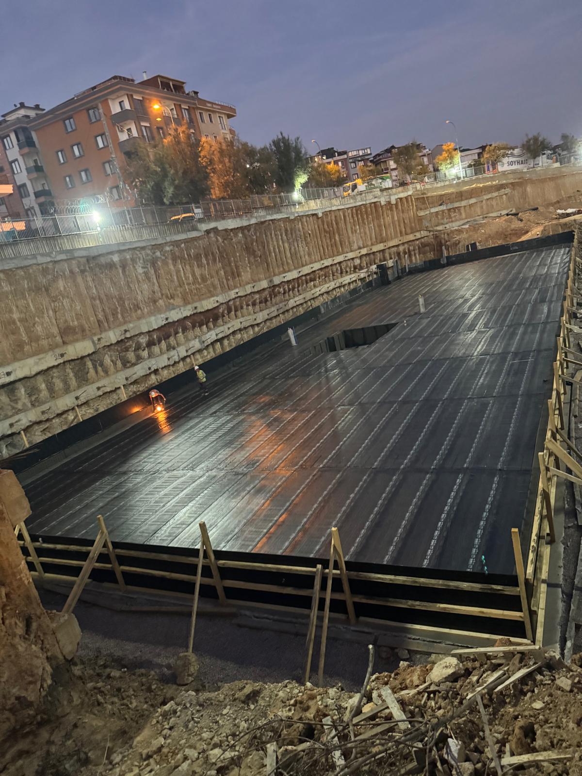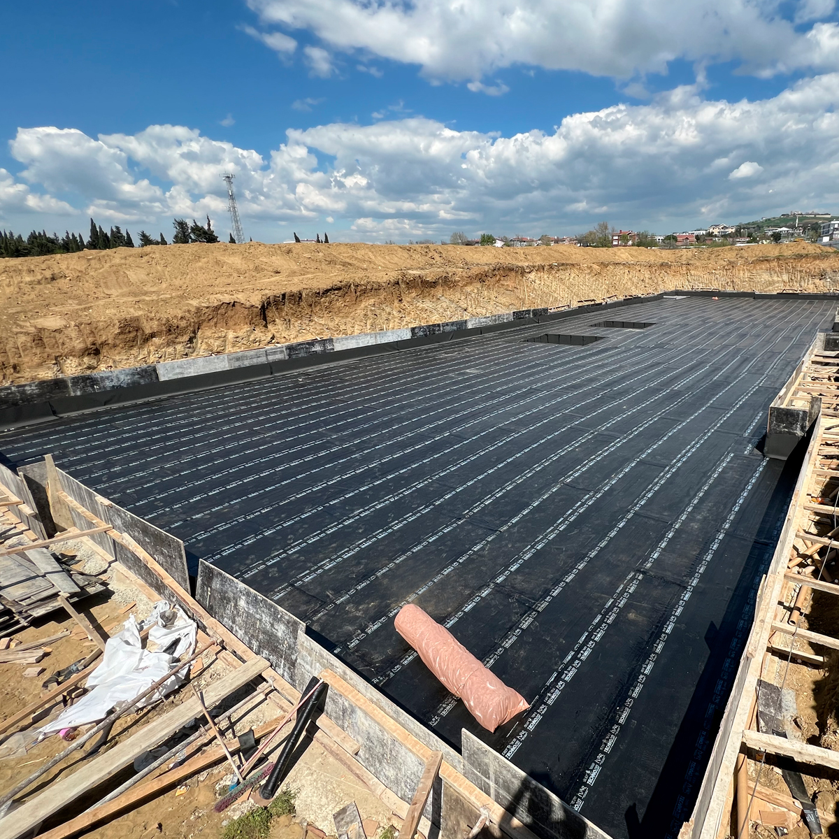 Grobeton dökümü sonrasında makina perdah yapılır. Hazırlanmış olan grobeton yüzeyi kuru durumda iken SBS (Styrene Butadine Styrene) Polimer ile modifiye edilmiş, 5 mm homojen kalınlığa sahip, içerisinde veya yüzeyinde taşıyıcı keçe ve yapısında dolgu malzemesi (kalsit v.b.) içermeyen, her yöne %1600 esneyebilen, -25°C soğukta esnekliğini koruyan, alt ve üst yüzeyi zemine tam yapışmaya olanak sağlayan PE Film kaplı, kendi kendini tamir edebilen ve üç boyutlu işlenebilen bitüm esaslı su yalıtım örtüsü tek kat olarak uygulanır.