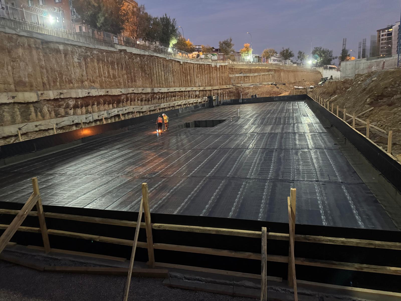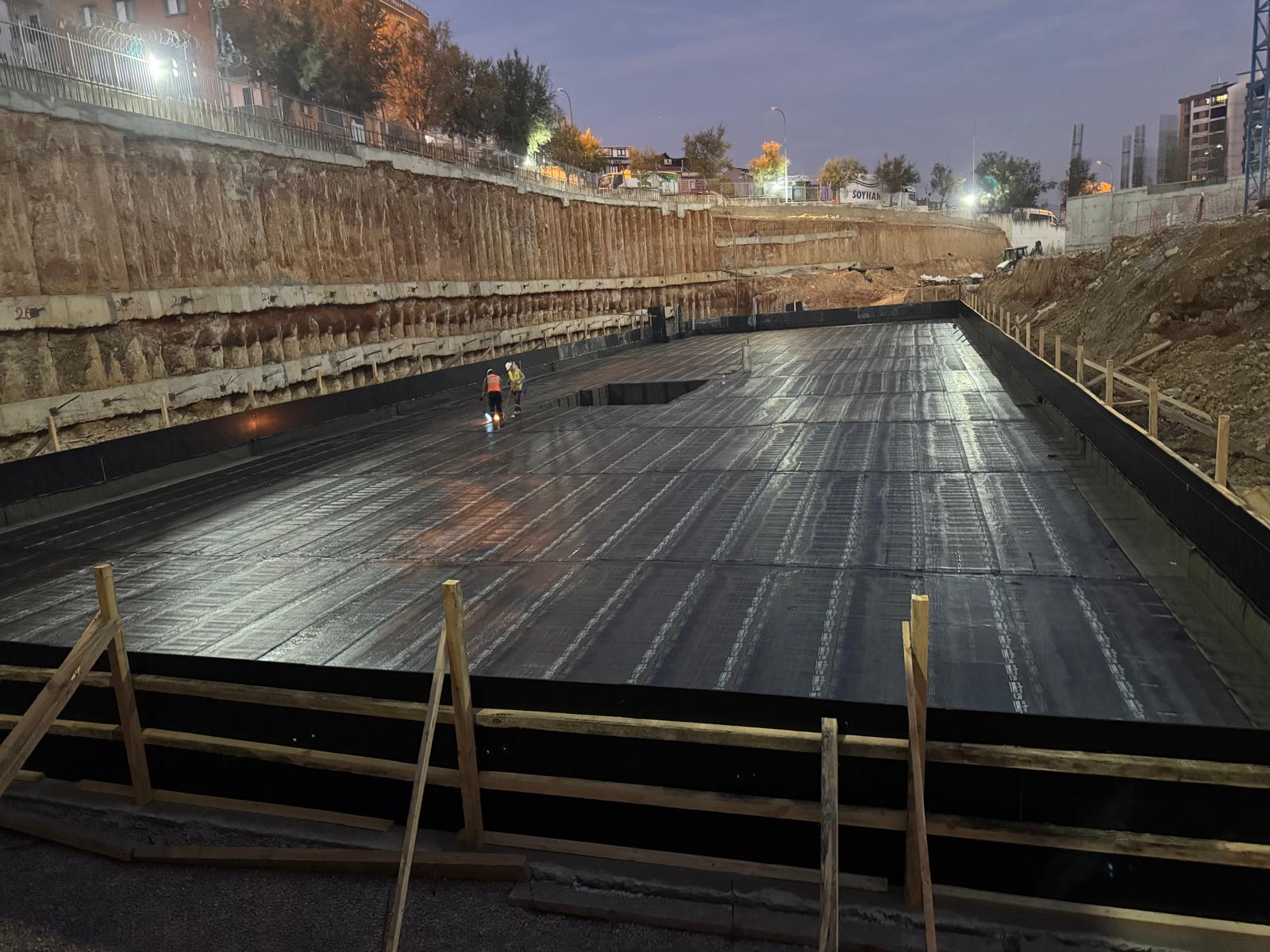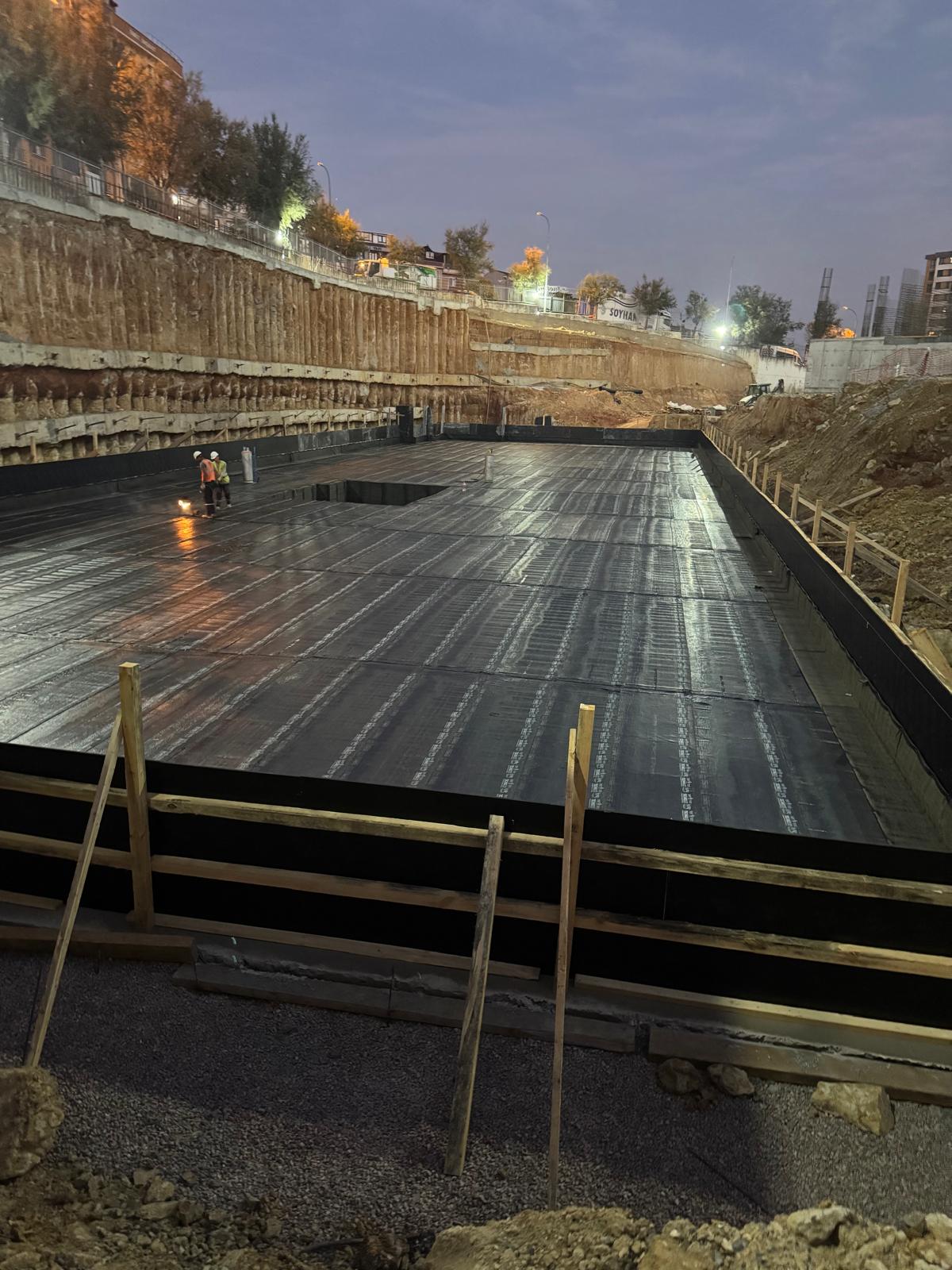 Grobeton dökümü sonrasında makina perdah yapılır. Hazırlanmış olan grobeton yüzeyi kuru durumda iken SBS (Styrene Butadine Styrene) Polimer ile modifiye edilmiş, 5 mm homojen kalınlığa sahip, içerisinde veya yüzeyinde taşıyıcı keçe ve yapısında dolgu malzemesi (kalsit v.b.) içermeyen, her yöne %1600 esneyebilen, -25°C soğukta esnekliğini koruyan, alt ve üst yüzeyi zemine tam yapışmaya olanak sağlayan PE Film kaplı, kendi kendini tamir edebilen ve üç boyutlu işlenebilen bitüm esaslı su yalıtım örtüsü tek kat olarak uygulanır.