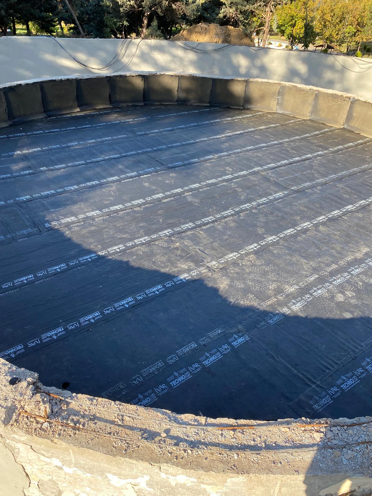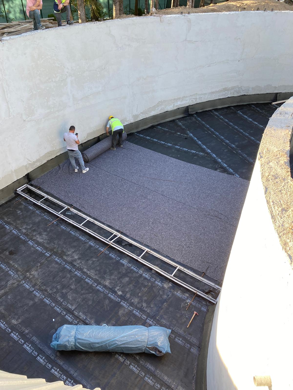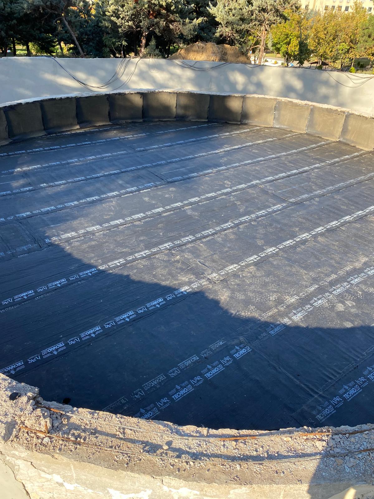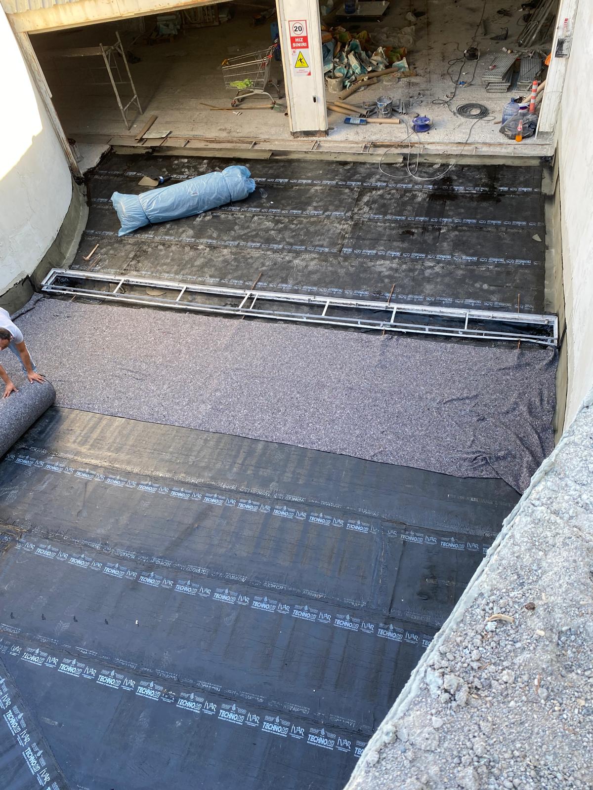 Teras çatı döşemesinde C20/25 beton sınıfına sahip eğim betonu makine perdahlı olarak atılmalıdır. Hazırlanmış olan beton yüzeyi temizlenmelidir. Parapet yüzeylerinde ise öncelikle yüzeydeki yağ, pas, kir, toz v.b. yüzeye tutunamayan gevşek malzemelerden temizlenmelidir. Yüzeyde oluşan segregasyon, soğuk derz gibi yüzey bozuklukları yapısal tamir harcı tekniğine uygun olarak düzeltilmelidir. Kuru durumda iken minimum 0,400 kg/m2 sarf edilecek biçimde (TS 113) bitüm astar sürülür. Bitüm astar kuruduktan sonra SBS (Styrene Butadine Styrene) Polimer ile modifiye edilmiş, 5 mm homojen kalınlığa sahip, içerisinde veya yüzeyinde taşıyıcı keçe ve yapısında dolgu malzemesi (kalsit v.b.) içermeyen, her yöne %1600 esneyebilen, -25°C soğukta esnekliğini koruyan, alt ve üst yüzeyi zemine tam yapışmaya olanak sağlayan PE Film kaplı, kendi kendini tamir edebilen ve üç boyutlu işlenebilen bitüm esaslı su yalıtım örtüsü tek kat olarak uygulanır.